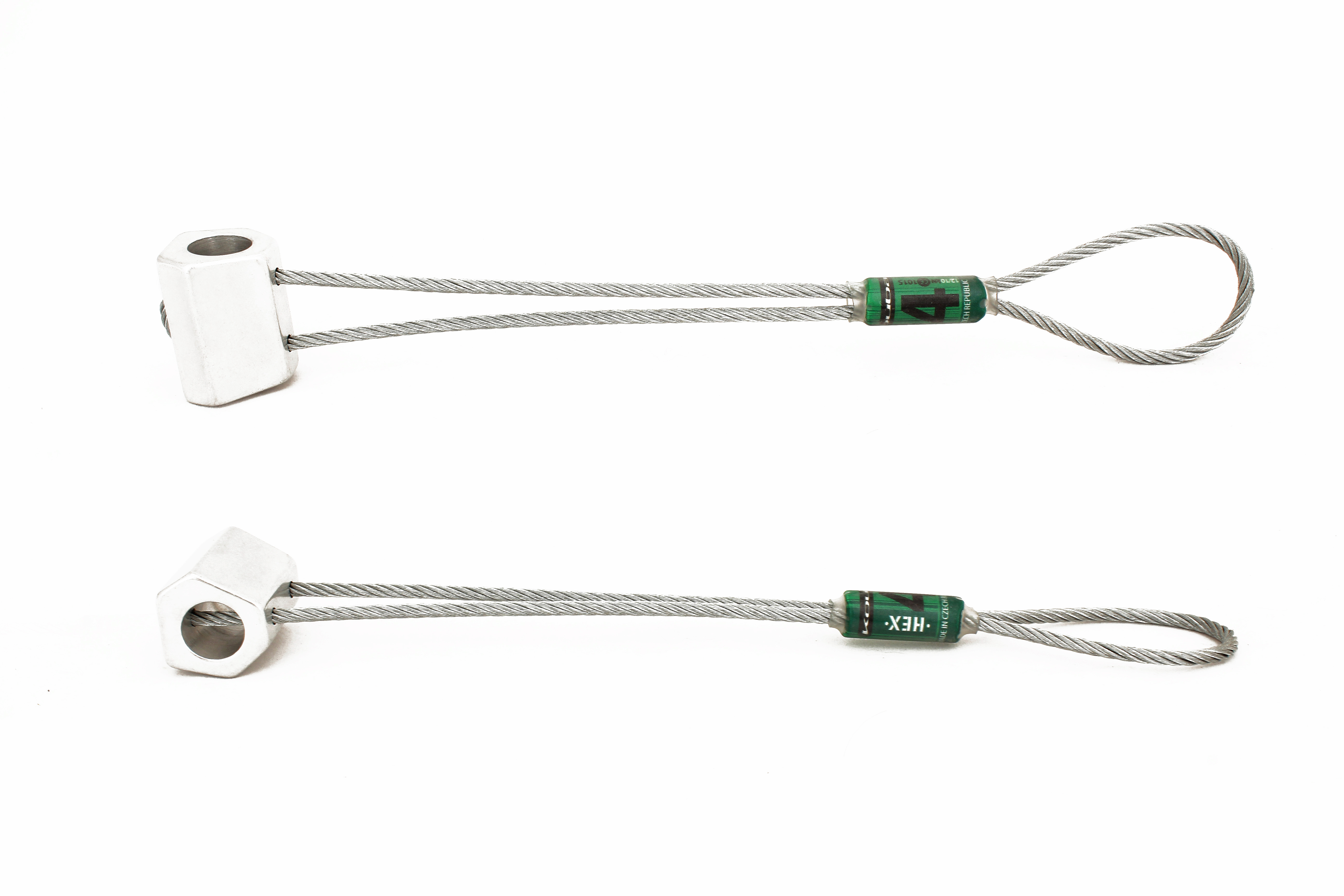 Great aluminum hexagonal nuts on a steel wire. Hexes can be placed in three different positions.