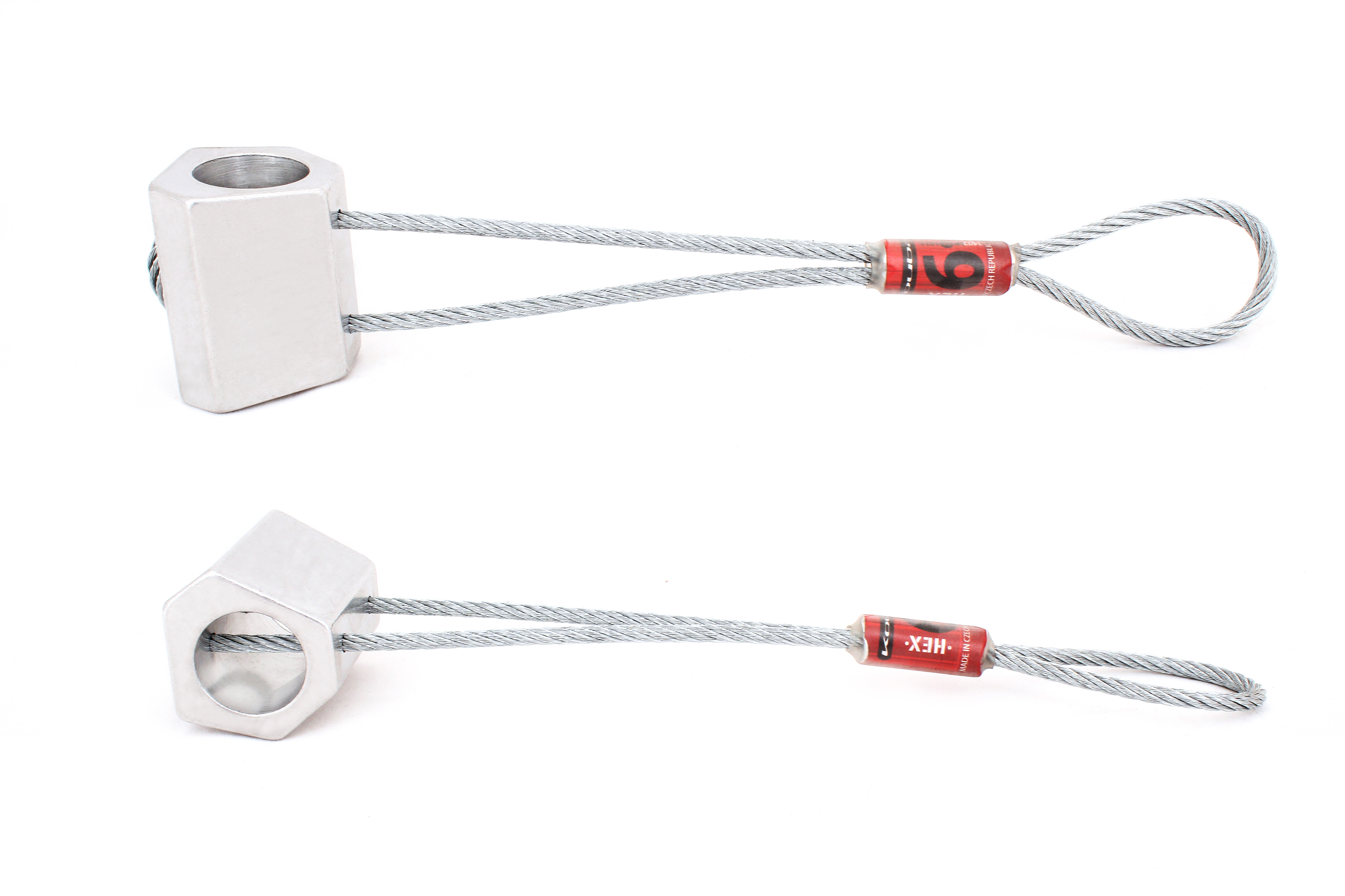Great aluminum hexagonal nuts on a steel wire. Hexes can be placed in three different positions.